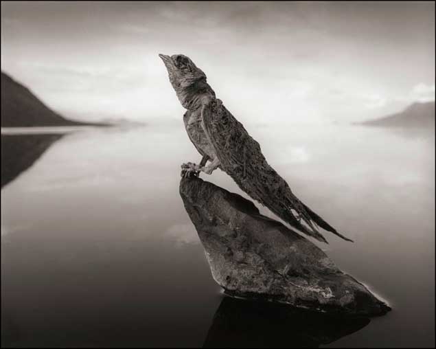 Se trata de Across the Ravaged Land, tercer volumen de una trilogía que el fotógrafo Nick Brandt ha realizado sobre la desaparición de especies en el continente africano. Brandt ha encontrado todo tipo de pájaros y otros animales muertos en las orillas del Natrón, la mayor parte murió al chocar contra sus tranquilas aguas debido al perfecto reflejo que hacen del cielo. Los minerales del agua petrifican los cadáveres hasta convertirlos en momias. Brandt posicionó estrategicamente algunos restos hasta obtener las espectaculares fotografías.